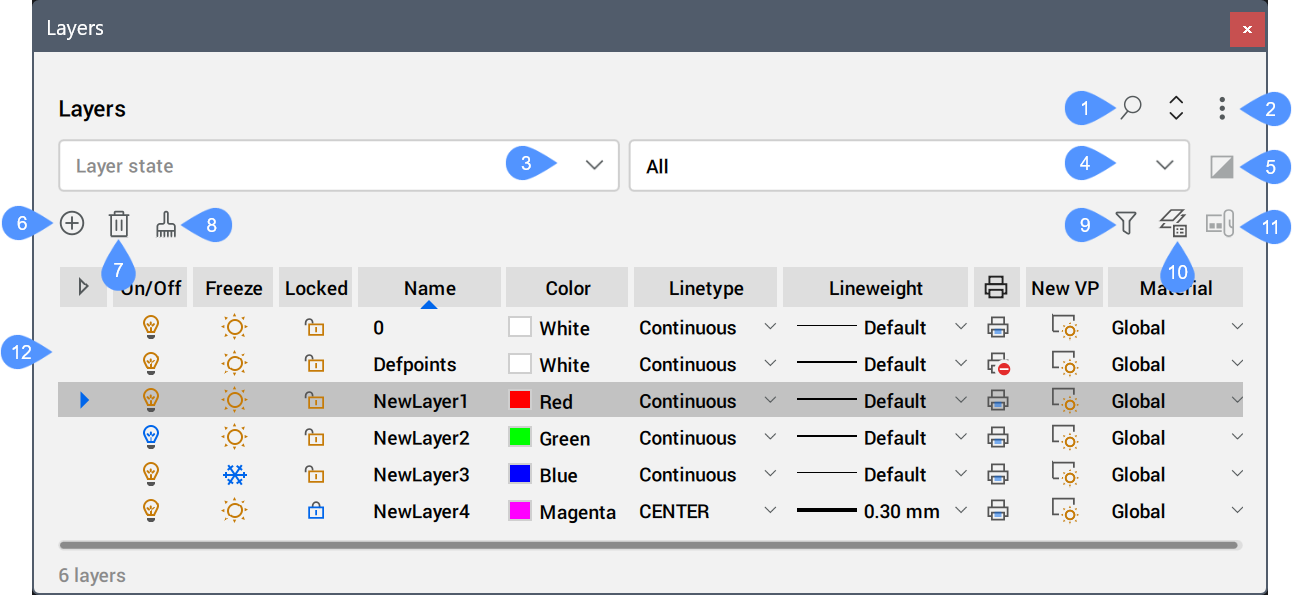 Exibe uma lista de camadas e suas propriedades. A lista pode incluir todas as camadas no desenho atual ou um subconjunto dessas camadas com base nos estados ou filtros de camada selecionados. Os cabeçalhos da coluna descrevem as propriedades de cada camada.