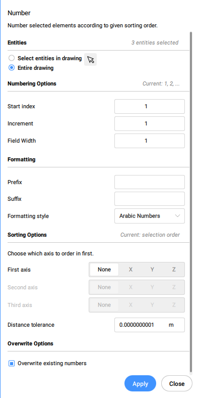 - Define a tolerância de distância para ordenamento na comparação. Os centróides de dois sólidos dentro de uma dada tolerância são considerados iguais e serão numerados em ordem de seleção.