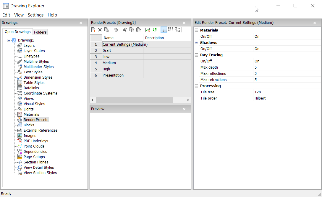 Abre a caixa de diálogo Explorer do Desenho com a categoria RenderPredefinições selecionada para visualizar e modificar predefinições de renderização no desenho atual.