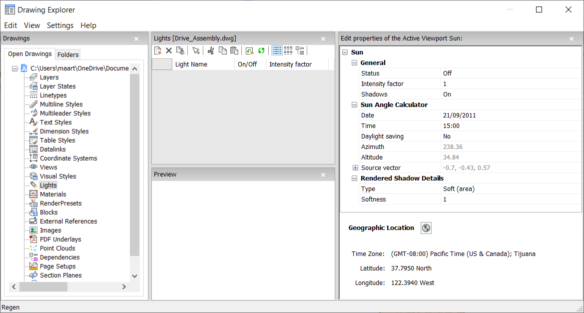 Abre o Explorer do Desenho com a categoria Luzes selecionada para visualizar e modificar as propriedades do Sol no desenho atual.