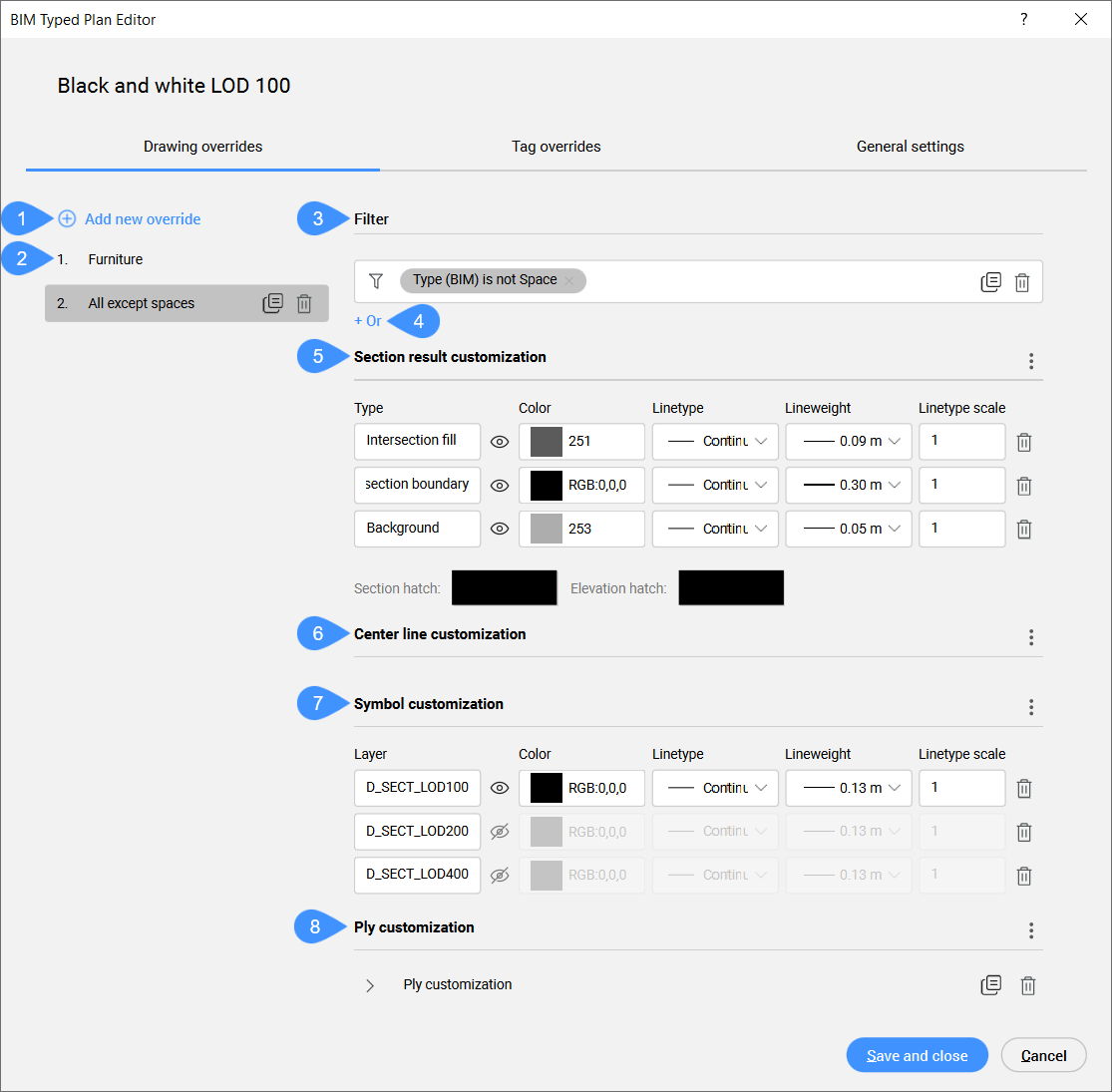 - Permite editar regras de filtro para substituições de desenho adicionando um ou mais filtros de parâmetro da lista suspensa. Linhas de filtro podem ser adicionadas ao filtro por múltiplas combinações de parâmetros. Estas linhas são separadas usando a operação lógica "OR". As linhas podem ser copiadas clicando no símbolo de cópia ou excluídas clicando no símbolo de exclusão.