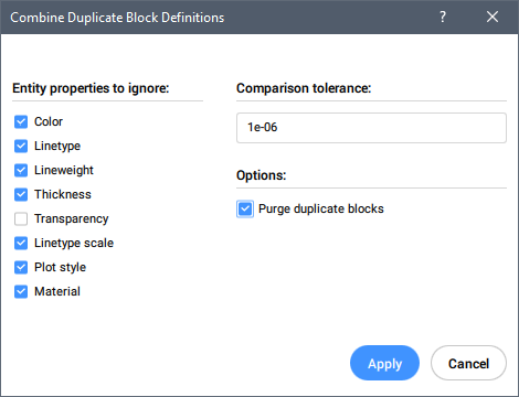 A caixa de diálogo Combinar Blocos Duplicados permite pesquisar no desenho por definições de bloco duplicadas, e substituir todas essas instâncias de bloco pela mais recente dessas duplicatas.