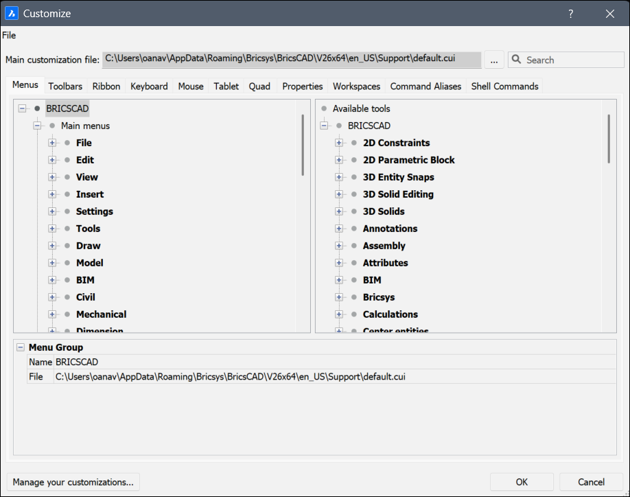 A caixa de diálogo Personalizar permite que você personalize a interface do usuário do BricsCAD®.