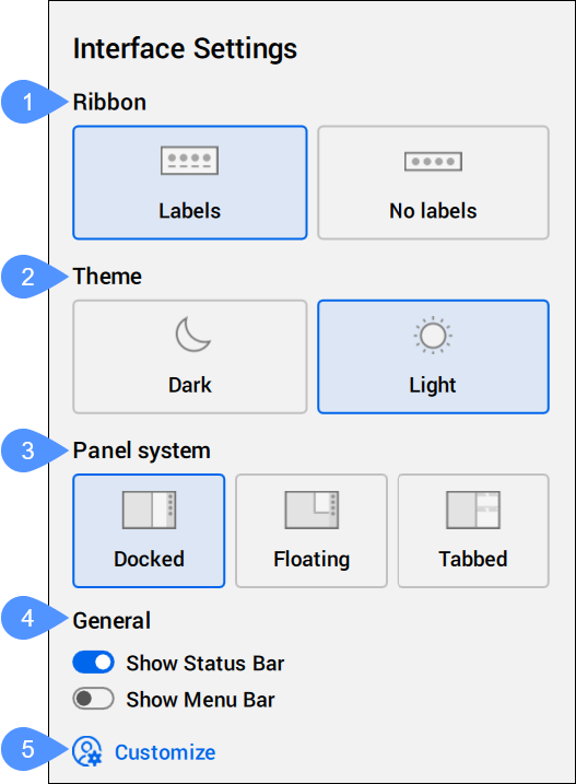 O botão Configurar interface está localizado no canto superior direito da Faixa de opções. A variável de sistema RIBBONSETTINGSENABLED controla se o botão é exibido ou não.
