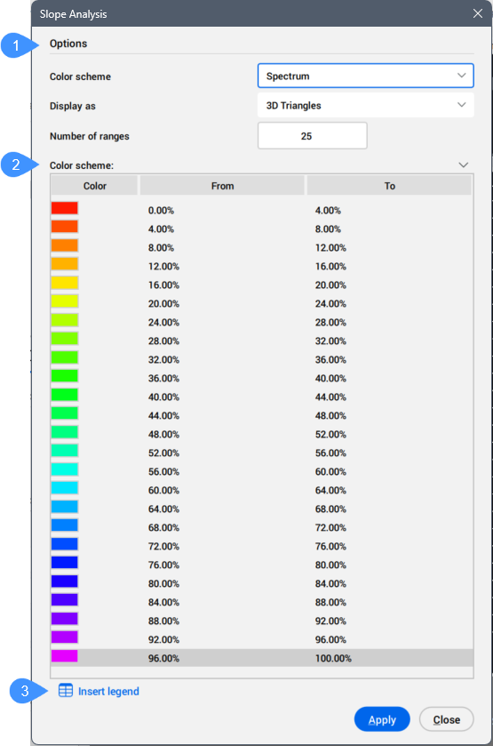 Abre via: (somente para entidades selecionadas de Superfície TIN) painel Explorer de Civil > aba Estilos Visuais > seção Análise TIN > Análise de Declive > clique nos três pontos do lado direito