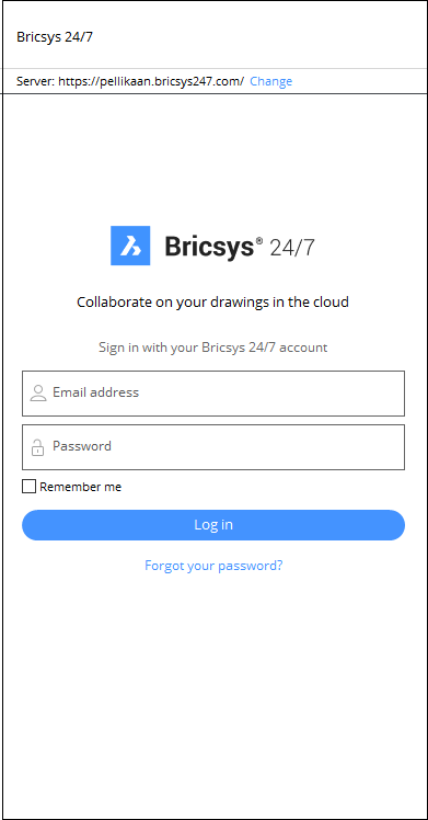 Ao clicar em Alterar, a caixa de diálogo Configurações é aberta na variável de sistema CLOUDSERVER para especificar outro endereço do servidor Bricsys 24/7. Para outros ambientes específicos, como https://pellikaan.bricsys247.com/, que não oferece suporte SSO neste momento, o login aparecerá conforme descrito abaixo.