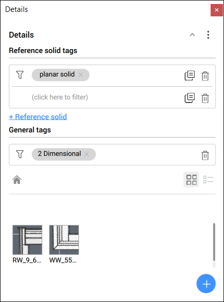 - Filtra os detalhes com base nas etiquetas de sólidos de Referência. Clique em + Sólido de Referência para adicionar um filtro e depois selecione um filtro a partir da lista suspensa. Você pode copiar ou excluir filtros clicando nos símbolos à direita.